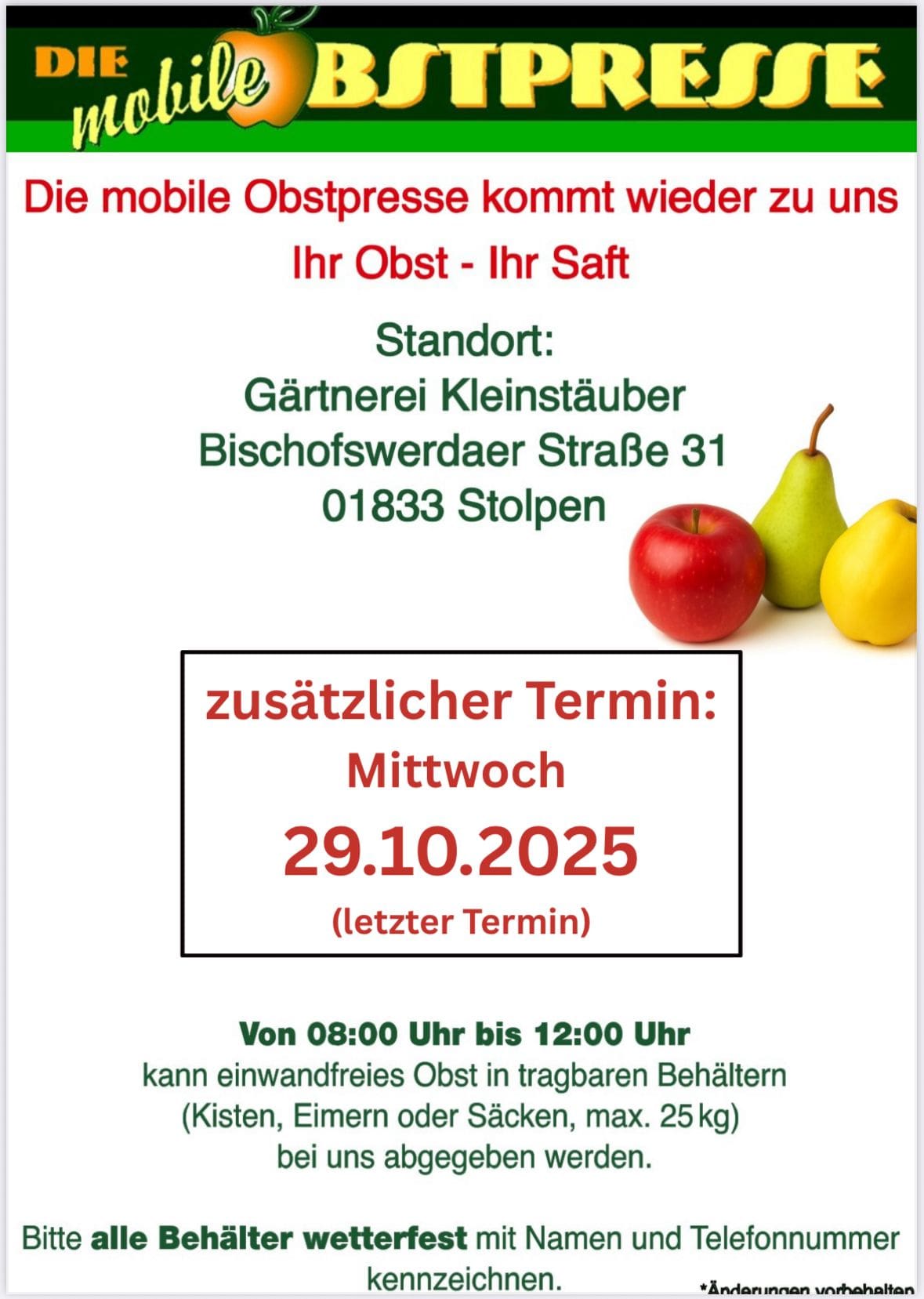 Fahren Sie anschließend in Ruhe nach Hause. Das Obstpresse-Team ruft Sie an, sobald Ihr Posten fertig ist.